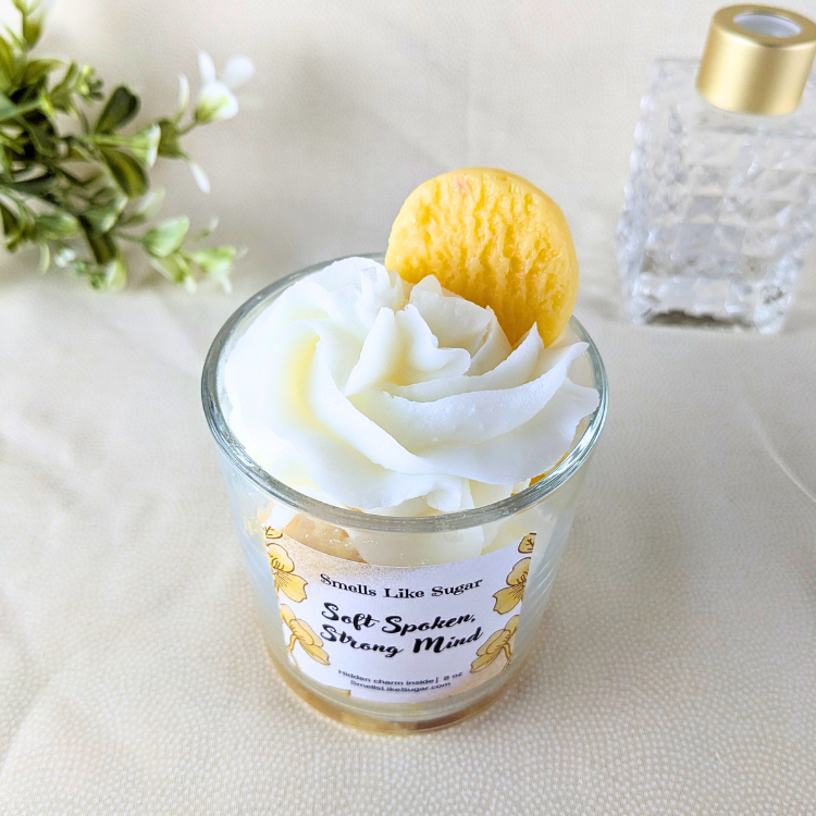 This candle smells like warm vanilla and soft serve ice cream. It's made for the ones who lead with grace and take up space without making noise.